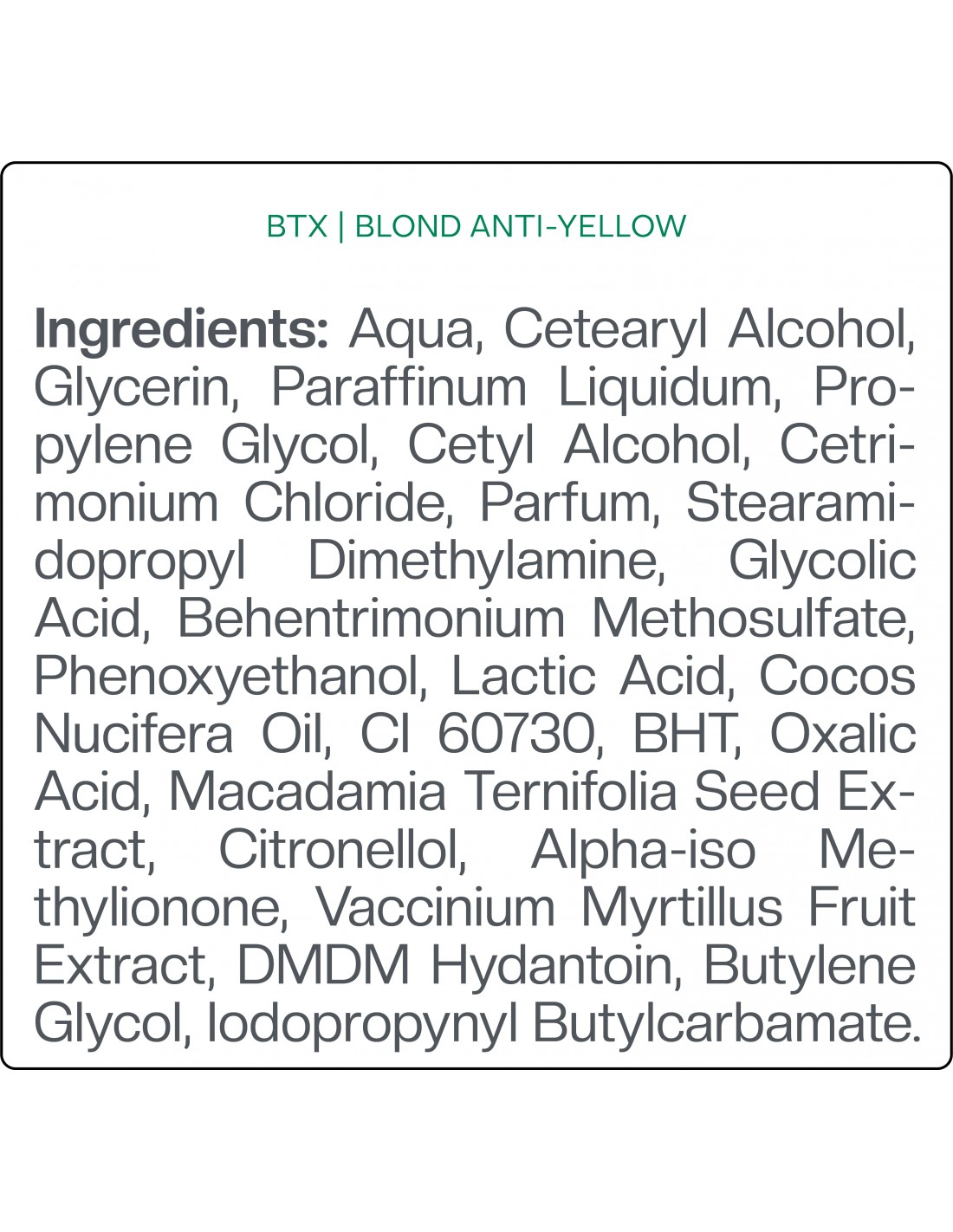 - BLOND ANTI-YELLOW aitab lahendada pleegitatud juuste peamised probleemid: vähendab särisemist, lendu ja mahu kontrolli; muudab juuksed läikivaks, kontrollides samal ajal soovimatute kollaste toonide ilmumist; ja lillad pigmendid annavad pärlendava välimuse;