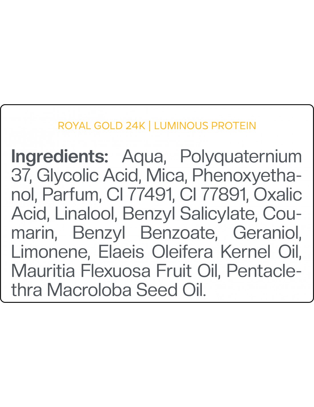 2) Valmistage ROYAL GOLD 24k LUMINOUS PROTEIN kasutamiseks ette: raputage pudelit/kaussi ettevaatlikult ja lisage nõutav kogus toodet kaussi (mitte metallist). Kasutage juuksevärvi harja ja kammi, et toode juustele jaotada.