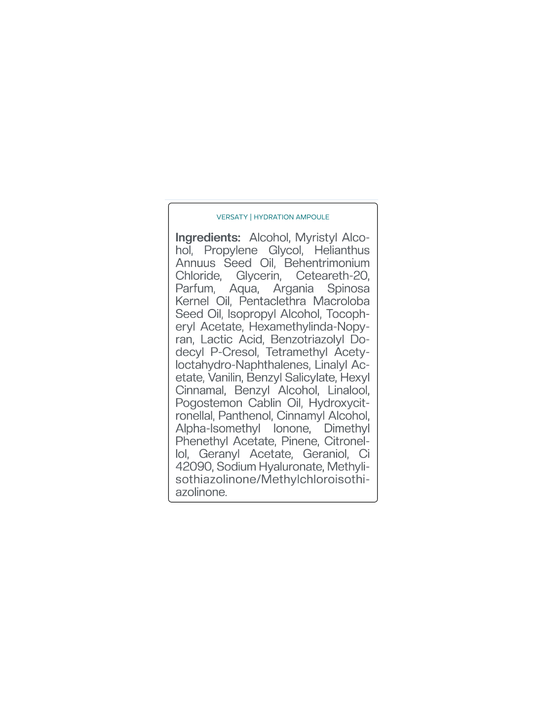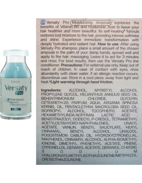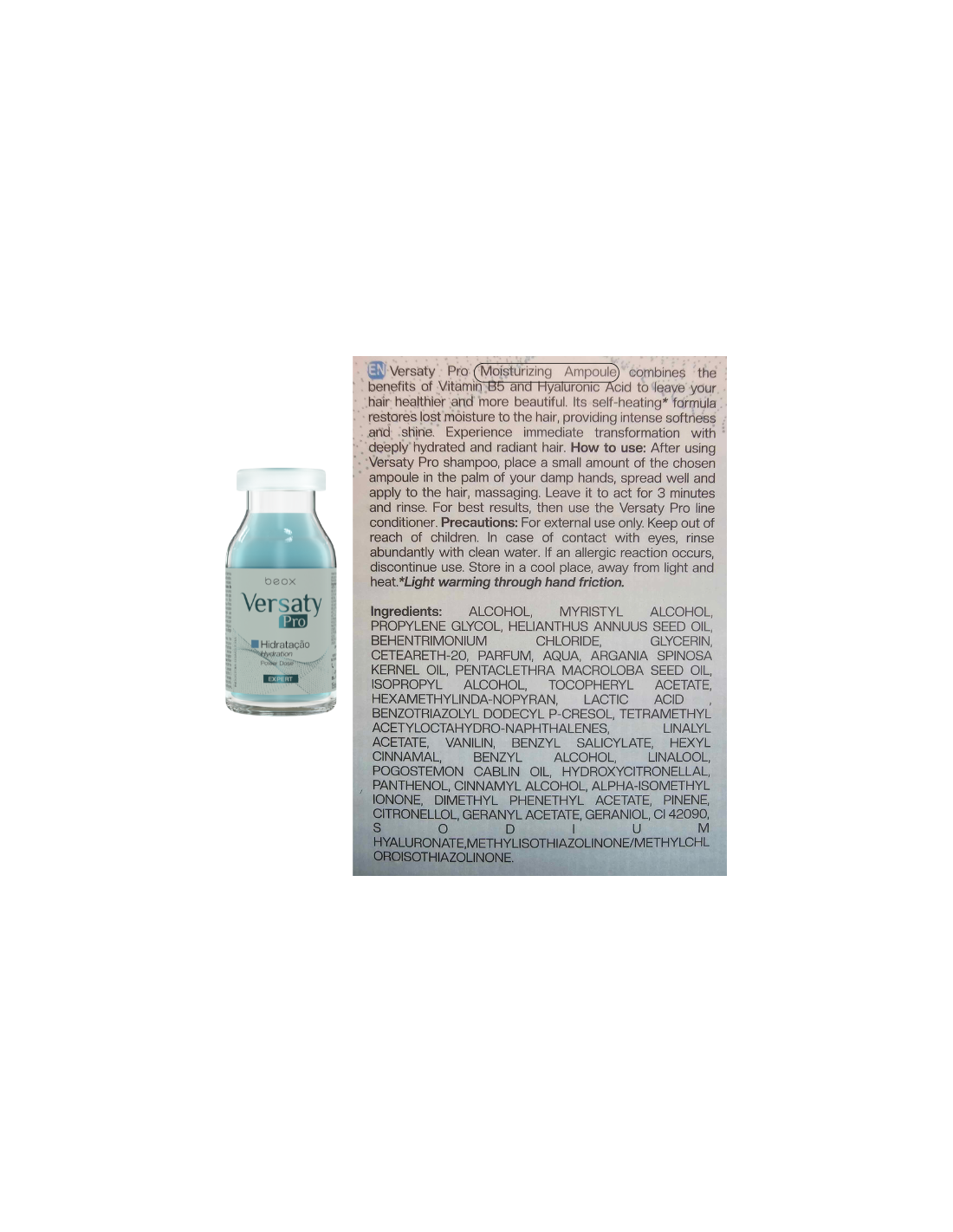 2. SAMM – Pange mõni tilk valitud VERSATY ampulli monodoosi sisu oma peopesadele, hõõruge need kokku (soojendage), et peopesadele tekiks juuksemaski konsistentsiga paks soe mass, ja jaotage see sama ühtlaselt. võimalikult juustele kogu pikkuses. Hoidke 3-5 minutit, loputage veega;