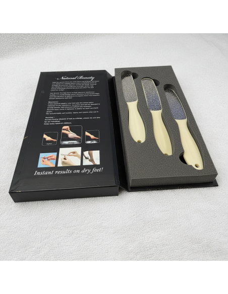 Komplektis on kolm ühepoolset pediküürirasplit. Kuivanud, pragunenud jalgade/kandade naha ja paksendite eemaldaja. Eriline kuju võimaldab jõuda raskesti ligipääsetavatesse kohtadesse, see on ergonoomiline ja hügieeniline. Ideaalne nii professionaalseks kui isiklikuks kasutamiseks. Väga vastupidav. Saab desinfitseerida.