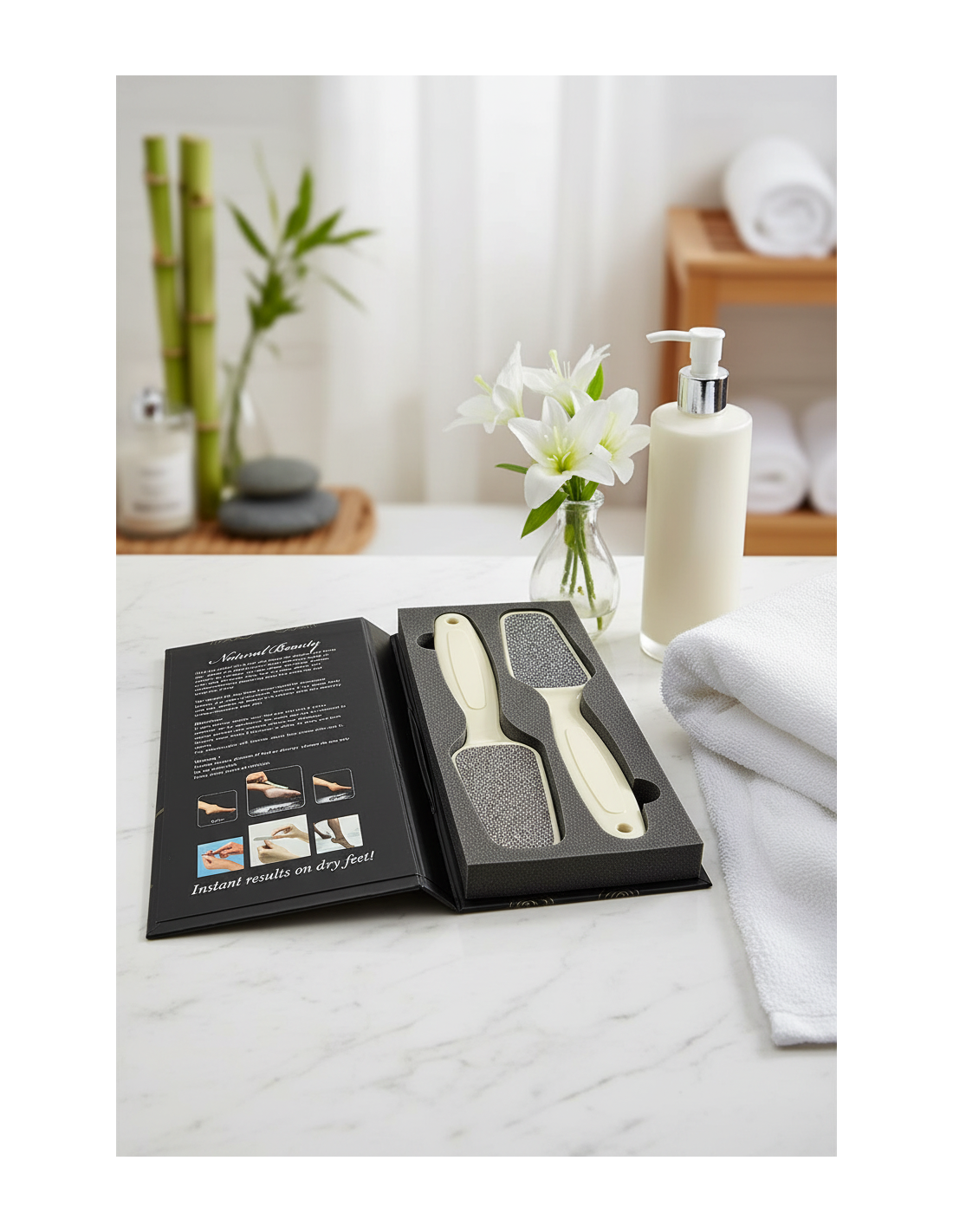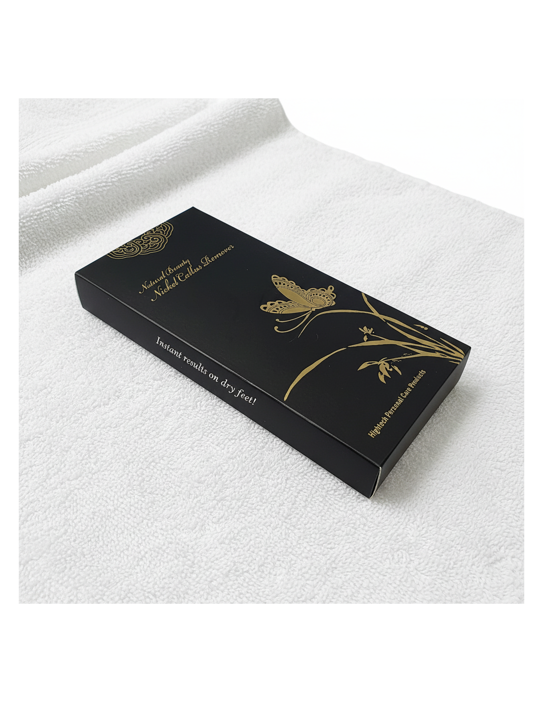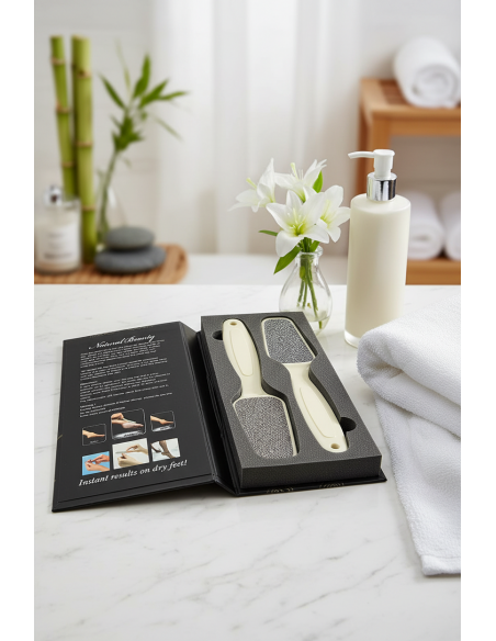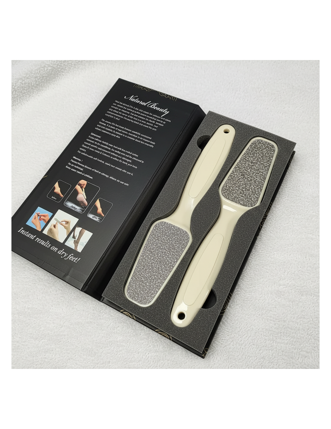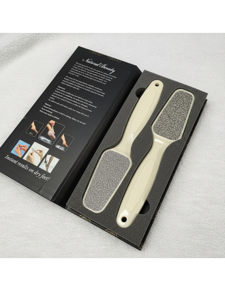 See on niklist valmistatud kahepoolne pediküürirasplite komplekt väga ilusas kastis. Sobib suurepäraselt kandade viilimiseks. Pehmem raspli pool - kandade kuiva naha eemaldamiseks ja tervisliku kannanaha tagamiseks. Väga vastupidav. Saab desinfitseerida. Toode on suurepärane kingitus kõigile, kes hoolivad ilusatest kandadest, eriti naise jaoks.