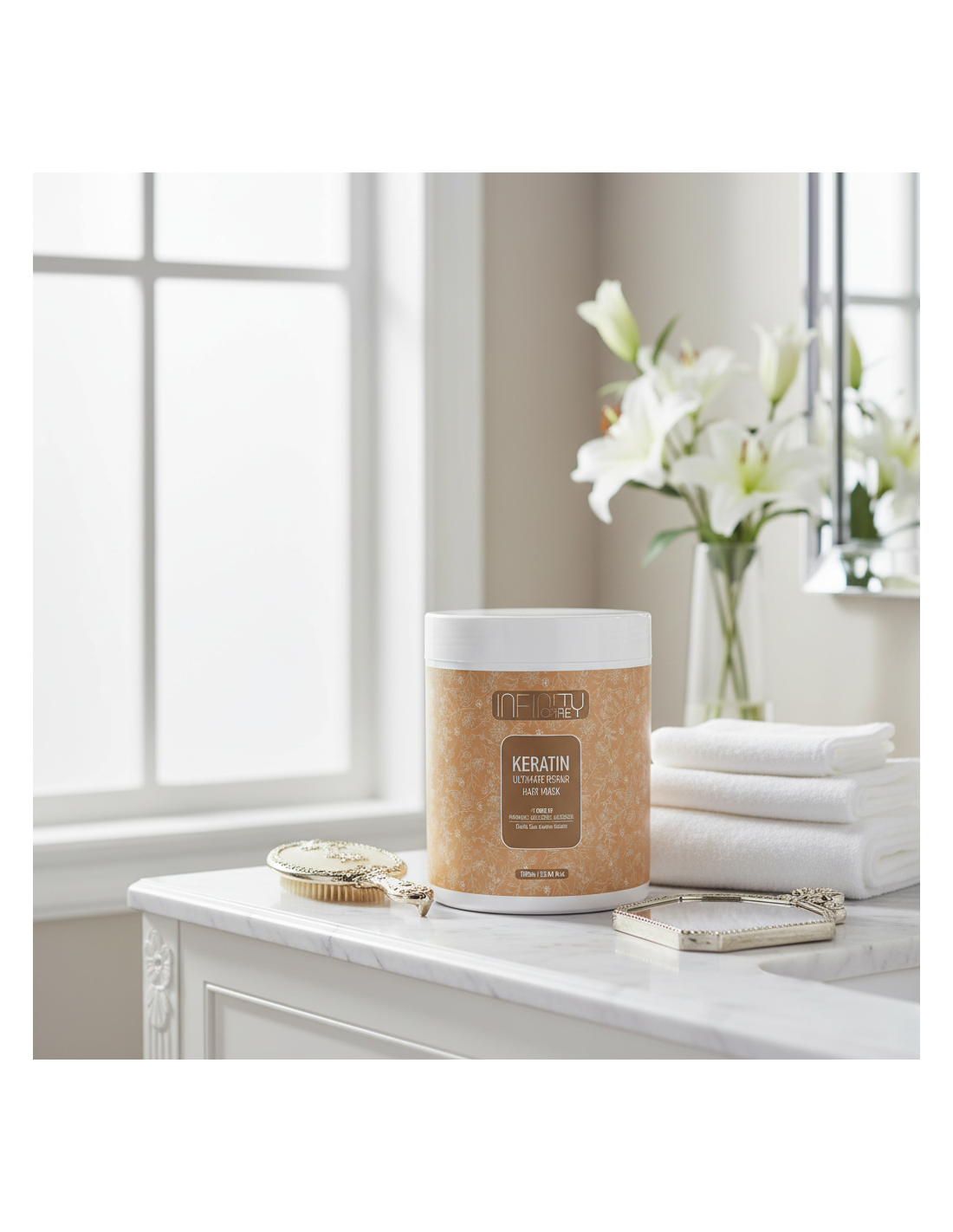 Avasta Keratin Ultimate Repair juuksemask 1000ml – ideaalne lahendus juuste taastamiseks ja läike andmiseks. ✨ Tänu hüdrolüüsitud keratiinile, millel on juustele kaitsev ja toitev toime, taastab see mask kahjustatud piirkondades juuksekiude seestpoolt, luues terved ja läikivad juuksed.