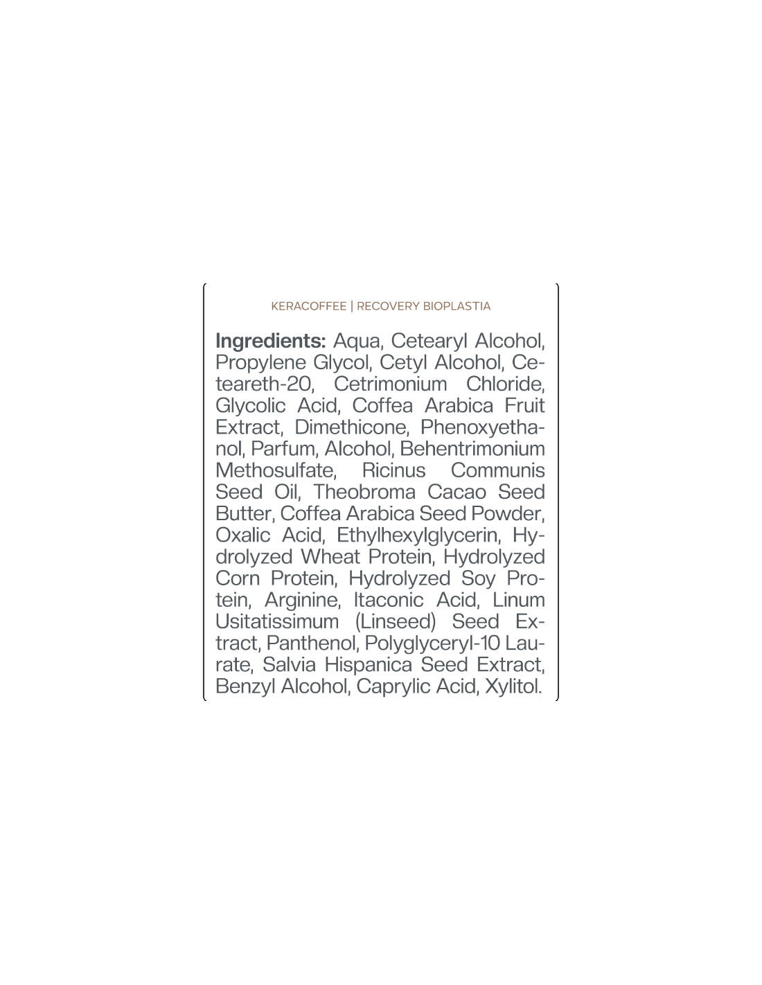 СОСТАВ: аминокислоты кератина, гидролизованные протеины риса, гидролизованный кератин, экстракты растений: аргановое масло, экстракт алоэ, масло семян купуасу, масло астрокарии колючей, экстракт календулы, масло макадамии, комплекс водорослей, экстракт семян кофе арабика, эксклюзивные аминокислоты (полученные из Комплекс (растений и их плодов) бассейна Амазонки.