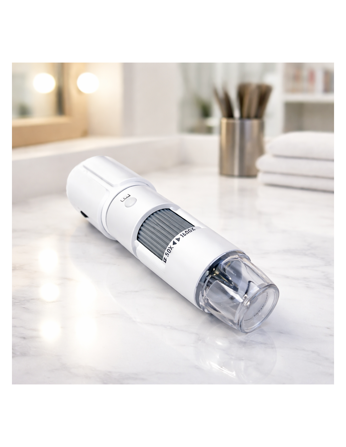 С помощью ручки на трихоскопе включите максимально мощную подсветку 8 светодиодных лампочек в головке.