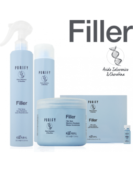 PURIFY FILLER — это комплексная линия профессиональных средств по уходу за волосами и процедура для ломких, изношенных волос, склонных к ломкости и ломкости (например, под воздействием процедур обесцвечивания, осветления, окрашивания и агрессивных продуктов), придающая волосам необходимую силу, гибкость , плотность и объем, борьба с признаками старения («антивозрастной» эффект), наполнение глубокой структуры волос эксклюзивным комплексом гиалуроновой кислоты и кератина, действующим по принципу беспрецедентной синергии.